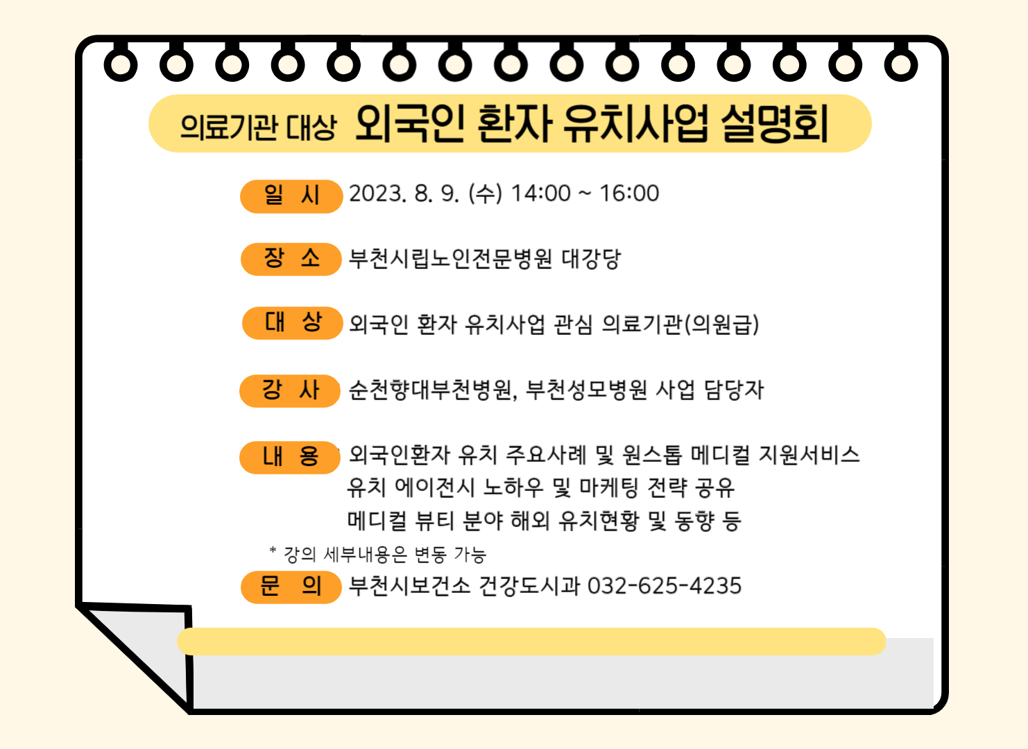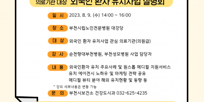 2일 부천시(시장 조용익)는 의료기관 대상 외국인 환자 유치 활성화를 위한 사업 설명회를 오는 8월 9일(수) 부천시립노인전문병원 대강당에서 개최한다고 밝혔다.
