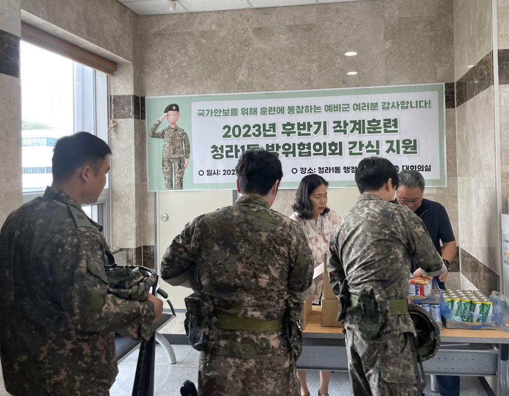 22일 인천 서구 청라1동 방위협의회(회장 송해달)가 18일부터 21일까지 진행된 후반기 작계훈련에 참석한 예비군에 간식을 전달했다고 밝혔다.