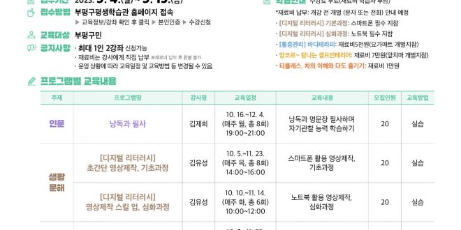 부평구(구청장 차준택) 평생학습관은 9월 4일부터 15일까지 ‘일상으로 스며든 시민교육 프로그램’ 하반기 수강생을 선착순으로 모집한다.
