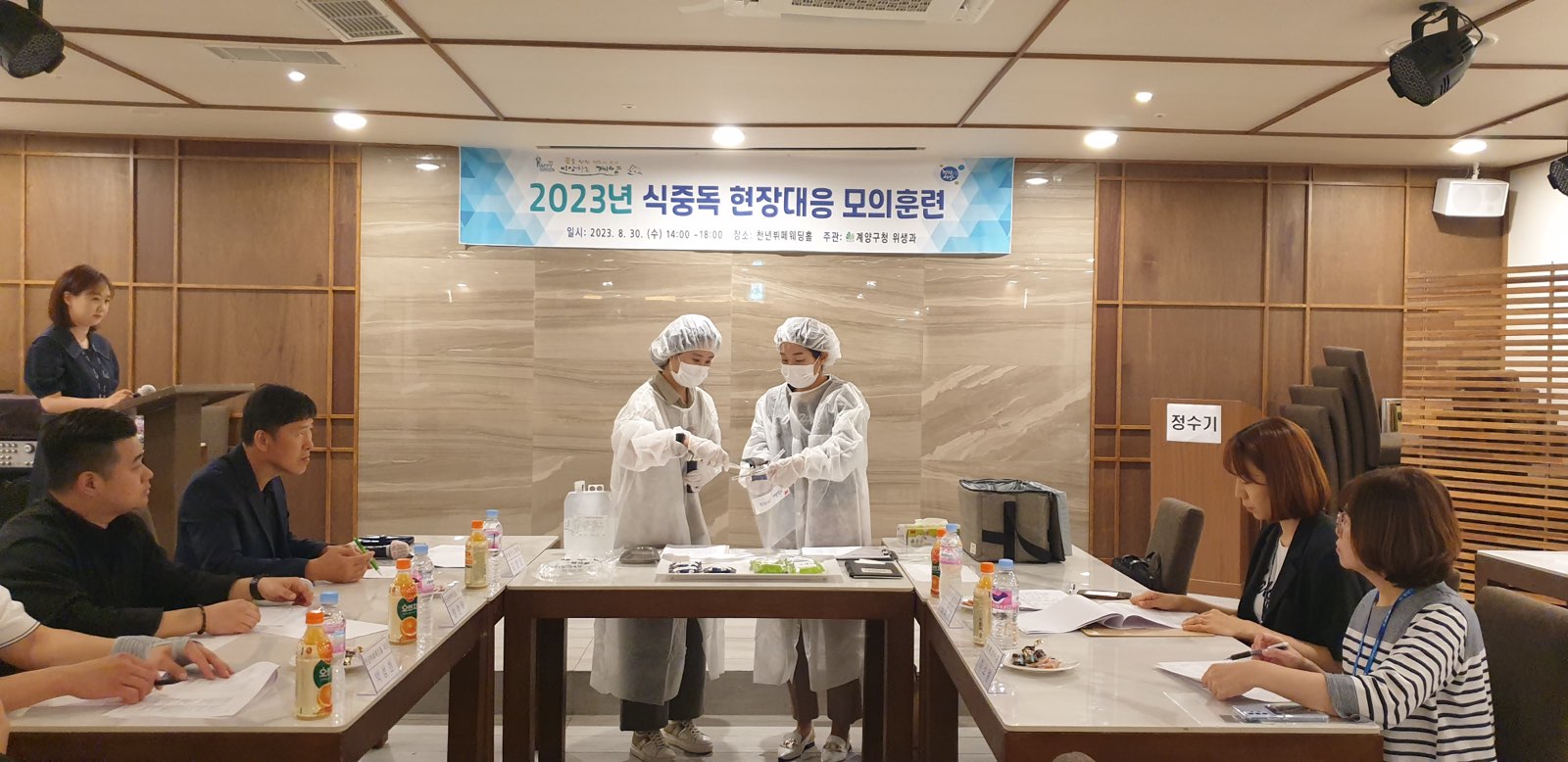 최근 30일 인천시 계양구(구청장 윤환)는 천년뷔페웨딩홀에서 ‘2023년 식중독 현장대응 모의훈련’을 실시했다.