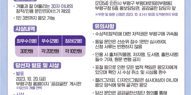 부평구(구청장 차준택)가 9월 4일부터 10월 4일까지 한 달간 ‘2023년 겨울편 공감글판’ 문안을 공모한다.