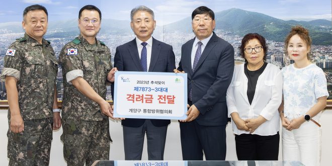 최근 13일 인천시 계양구 통합방위협의회 의장 윤환 계양구청장과 하재현 수석부의장을 비롯한 위원들이 구청 소회의실에서 제7873부대 3대대에 위문금을 전달했다.