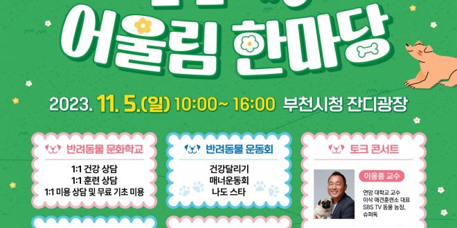 12일 부천시는 ‘2023 부천시 반려동물 어울림 한마당’ 행사가 오는 11월 5일 부천시청 잔디광장에서 개최된다고 밝혔다.