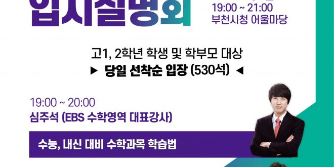 14일 부천시가 오는 12월 21일 19시에 시청 어울마당에서 고등학교 1, 2학년 학생 및 학부모를 위한 ‘EBS 입시설명회’를 개최한다고 밝혔다.