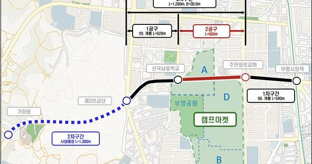 캠프마켓을 지나는 3차 구간(주안장로교회~제3보급단, 1,280m)은 미군기지 반환과 토양정화의 문제로 1공구와 2공구로 나눠 공사한다. 1공구(산곡남중학교~제3보급단)는 지난 2020년 개통됐지만, 2공구(주안장로교회~산곡남중학교)는 지난해 12월 캠프마켓 D구역 반환과 A구역 토양정화가 완료되면서 이번에 착공하게 됐다.