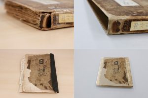 이렇게 장정된 기록물이 시간이 흐르면서 표지가 약해지고 위·아래 금속구와 분리된 상태였다. 한편 ‘일지’는 끈으로 표지와 본문을 고정해 놓았고, 손상이 심한 책은 직물로 임시 보수해 놨었다.
