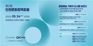 인천문화재단이 오는 5월 24일(토) 16시 인하대학교 60주년 기념관에서 제2회 인천문화정책포럼을 개최한다. 인천문화예술의 정책적 방향을 모색하고 시민·예술인·학계와의 정책 거버넌스 구축을 위해 마련되었다.