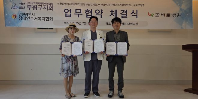 3일 인천시장애인주거복지협회(회장 송수연), 인천지체장애인협회 부평지회(회장 전병천)가 인천의 관절전문병원 ‘곧바로병원’(원장 신승준)과 의료업무협약을 맺었다.