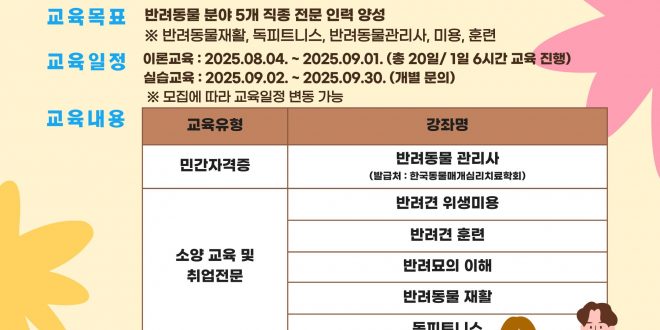 구 관계자는 “이번 교육과정을 통해 ‘교육-실습-취업 연계형 체계’를 구축하게 된다”면서 “지역 내 일자리 창출을 실현함과 동시에 반려동물 서비스 품질 향상을 기대한다”고 전했다.
