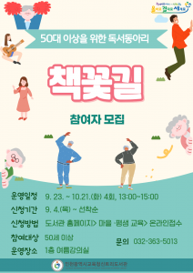 인천시교육청 신트리도서관은 50대 이상 시민을 대상으로 ‘책꽃길’ 독서동아리를 오는 9월 23일(화)부터 10월 21일까지 매주 화요일 총 4회 운영한다.