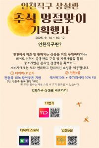 온라인 행사는 ‘11번가’와 ‘네이버’ 인천직구 상설관에서 9월 14일부터 10월 12일까지 진행된다. 행사 기간 동안 입점 상품 전 품목에 대해 15% 할인쿠폰이 제공되며, 각 플랫폼 검색창에 ‘인천직구’를 입력하면 인천직구 상설관에 입점한 제품을 쉽게 확인하고 구매할 수 있다.