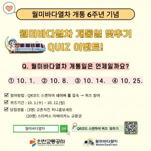 인천교통공사는 월미바다열차 개통 6주년을 맞아 오는 10월 1일부터 12일까지 고객감사 퀴즈 이벤트를 진행한다고 30일 밝혔다.