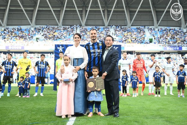 8일 오후 인천축구전용경기장에서 열린 수원 삼성 전에 앞서 스테판 무고사 선수에게 명예시민증을 수여하고 기념촬영하는 유정복 시장/사진=인천시 112823_173419_1721 THE BUPYEONG WEEKLY 2025/10/09 12:03 Leave a comment 63 Views