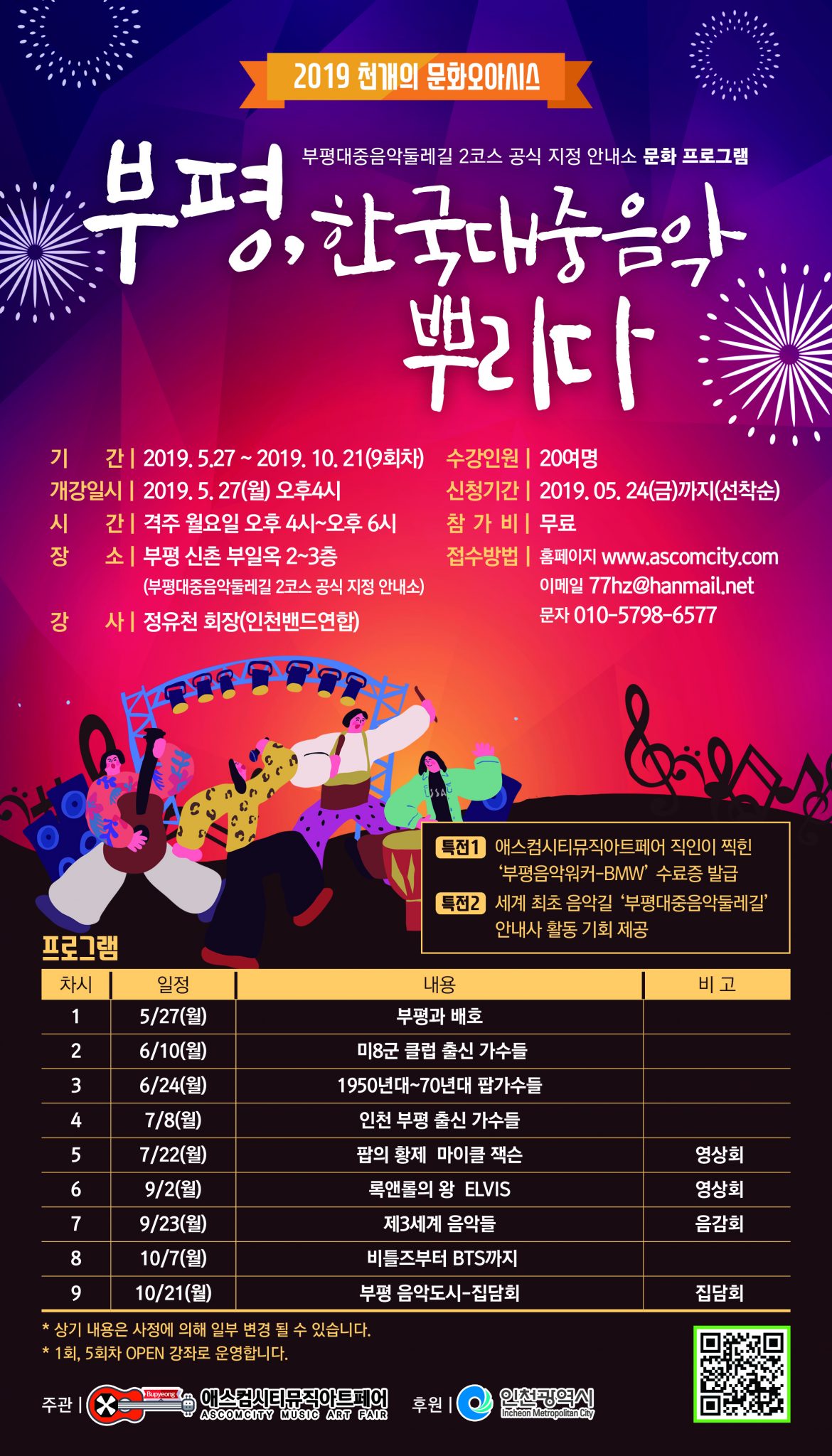 프로그램은 5월~10월까지 9차례로 나눠 오후4시부터 6시까지 부평대중음악둘레길2코스 공식지정 안내소 2-3층에서 열린다. 정유천 인천밴드연합 회장(기타리스트)이 문화프로그램을 이끈다.