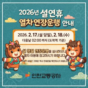 공사는 설 명절 당일인 2월 17일과 다음 날인 18일 이틀간 심야 임시열차를 투입한다. 1일 기준 인천1호선은 2회, 인천2호선은 4회 증편 운행해 종착역 기준 다음 날 새벽 2시까지 연장 운행한다.