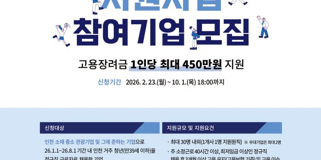 인천광역시와 인천관광공사는 지역 중·소 관광기업의 안정적인 인력 운영을 지원하고, 인천 거주 청년의 지속 가능한 일자리 창출을 위해 2026년 인천 중·소 관광기업 고용장려금 지원사업을 추진한다고 밝혔다.