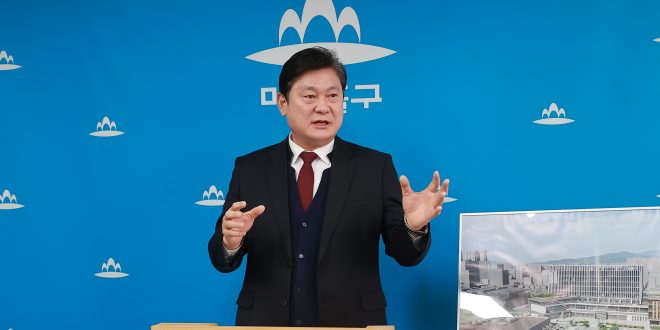 미추홀구 이영훈 구청장이 5일 오전 구청 본관 기자실에서 신청사 건립과 관련해 제기된 ‘사업 규모 960억 원 변경’ 주장에 대해 공식 입장을 발표했다.