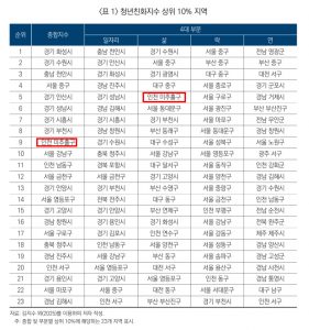 특히 미추홀구는 ‘삶(Life)’ 부문에서 전국 5위를 차지해 안정적인 주거 환경과 생활 인프라가 청년 유입과 정착에 긍정적으로 작용하는 것으로 평가됐다. 보고서는 청년층 지역 이동의 45%가 일자리 때문임을 지적하면서도, 실제로는 주거와 복지, 문화생활, 사회관계 등 폭넓은 환경이 정착을 좌우하는 주요 요인임을 강조했다.