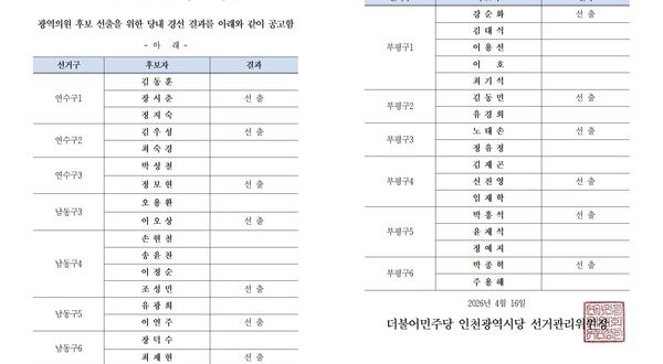 민주당 시당 선거관리위원회는 16일 밤 인천시의원 13개 선거구의 1차 경선 결과를 홈페이지에 공지했다.