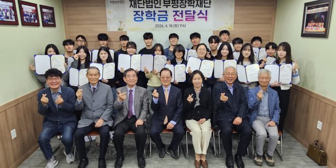 부평장학재단이 지난 18일 재단 사무국에서 ‘2026년도 장학증서 전달식’을 개최하여, 이사회 심의를 통해 장학생으로 선발된 대학생 27명에게 개인별 장학금 500만원씩 총 1억3500만원을 전달했다고 밝혔다.