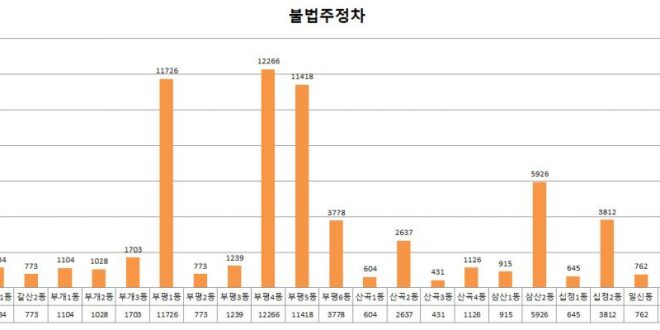 불법 주·정차는 1만2천266건을 기록한 부평4동이 가장 많았고, 1만1천726건의 부평1동, 1만1천418건의 부평5동이 뒤를 이었다. 부평5동은 주차확보율이 가장 높았지만 불법주·정차 단속 건수도 많았다.