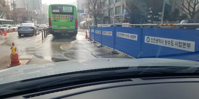 by 황찬 시민기자 2020년 2월 20일 오후에 간석오거리 일대 상수도관이 오래되어 터졌다. 간석3동 복지행정센터 지하에서 급수하고, 자정에 통수된다고 한다.