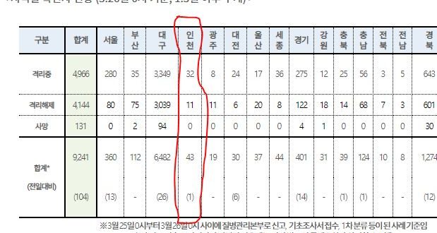 [3/25/0시] *( )전일대비 확진 43명(1명), 격리 32명(-), 완치퇴원 11명(1명), 사망 0명 - 질병관리본부