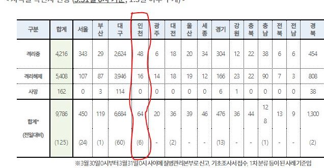[3/31/0시] 확진64명(6명), 격리48명(5명), 완치퇴원16명(1명), 사망0명 - [질병관리본부]