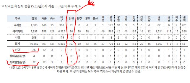 [5/13/0시] 코로나19 인천지수(전일대비 추가 2명) * 전국 추가 26명 확진107명(2명:해외0명,지역2명),격리21명(-2명),완치퇴원86명(4명),사망0명(-) [질병관리본부]