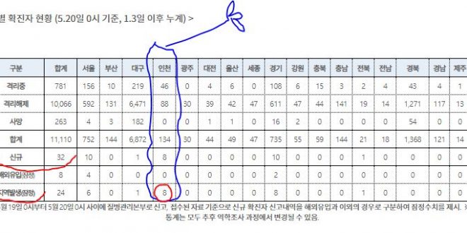 [5/20/0시] 코로나19 인천지수(전일대비 추가 8명: 지역감염) *코로나19 발생 이후에 인천에서 하루 동안 가장 많은 확진자 8명이 발생했다. 인천에서 방역의 고삐를 늦추면 안된다는 신호다. 확진134명(8명:해외0명,지역8명),격리46명(7명),완치퇴원88명(1명),사망0명 [질병관리본부]