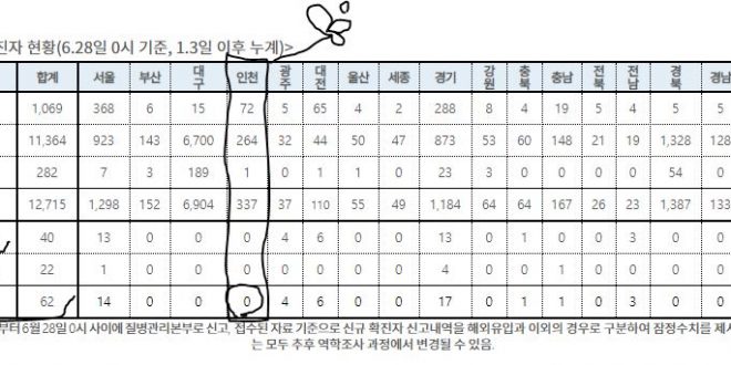[6/28/0시]코로나19인천지수: 확진337면(전일대비 추가 0명) 확진337명(0명:해외0명,지역0명),격리72명(-13명),완치퇴원264명(14명),사망1명(-) [질병관리본부]