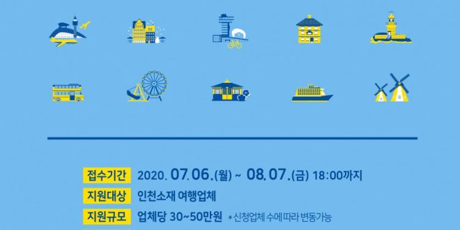 여행업체는 오는 7월 6일부터 8월 7일까지 인천관광공사 홈페이지(www.travelicn.or.kr)를 통해 온라인 비대면 신청만 가능하며, 지원금은 심사를 거쳐 8월중 업체에 지급 예정이다.