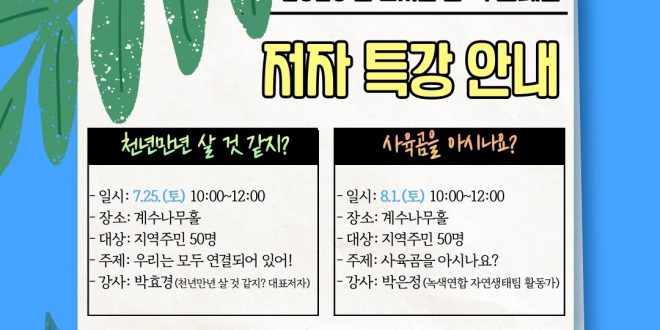 7월 25일(토) 1차 특강은 ‘천년만년 살 것 같지?’ 대표 저자 박효경 작가가 ‘우리는 모두 연결돼 있어!’라는 주제로 강의를 진행한다. 동계올림픽 스키장 건설로 사라진 500년 된 가리왕산 숲부터 로드킬까지 나의 선택과 행동이 이 지구상에 살고 있는 다른 생명들과 연결돼 있음을 이야기한다.