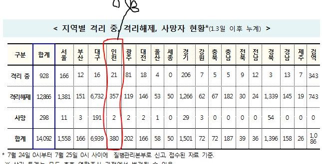[7/25/0시]코로나19인천지수: 확진380명(전일대비 추가 0명) 확진380명(0명:해외0명,지역0명),격리21명(-2명),완치퇴원357명(2명),사망2명(-) [질병관리본부]