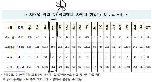 [7/29/0시] 코로나19인천지수: 확진383명(전일대비 추가 3명: 해외유입 2명, 지역감염 1명) 확진383명(3명:해외2명,지역1명),격리22명(1명),완치퇴원359명명(2명),사망2명(-) [질병관린본부]
