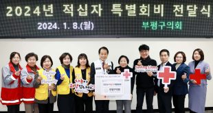by 정재환 기자 8일 인천 부평구의회(의장 홍순옥)는 대한적십자사 인천지사에 2024년 적십자 특별회비를 전달했다. 부평구의회 의정회의실에서 열린 이날 전달식은 홍순옥 의장, 이익성 부의장, 박영훈 의회운영위원장, 김숙희 행정복지위원장, 정유정 도시환경위원장과 대한적십자사 인천지사 관계자 등이 참석한 가운데 진행됐다. 부평구의회는 매년 적십자 특별회비를 전달하고 있으며, 적십자 회비는 어려움에 처한 이웃을 돕는 인도주의 사업에 사용될 …