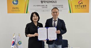최광석 기자 사단법인 한국미술협회 인천시지회(이하 인천미협)가 14일 수봉문화회관에서 ㈔세계여성평화그룹(IWPG) 글로벌 9국과 협력체계를 구축하는 상호협력 업무협약(MOU) 체결식을 가졌다. 인천 미술인들의 교류 공간인 인천미협은 인천 미술 발전을 위해 창작 활동과 국제 교류전 사업, 미술작품 공모전, 초·중고생 미술 실기대회 등 지역사회 미술 봉사활동에 관한 사업을 펼치고 있다. 강형덕 인천미협 회장은 “우선 IWPG를 알게 …