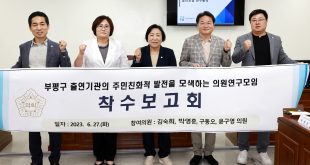 by 정재환 기자 최근 27일 부평구의회 의원연구단체인 ‘부평구 출연기관의 주민친화적 발전을 모색하는 의원 연구모임(대표의원 김숙희)’은 행정복지위원회실에서 출연기관의 주민친화적 발전모형 도출과 정책과제 발굴을 과업으로 하는 연구용역 착수보고회를 개최했다. 이날 보고회에는 ‘부평구 출연기관의 주민친화적 발전을 모색하는 의원 연구모임’ 소속의 김숙희, 박영훈, 구동오, 윤구영 의원을 비롯하여 용역수행 관계자 등이 참석했다. 이번 연구 용역의 …