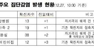 Read More »[12/28/0시] 확진2,700명*(46명:해외1명,지역45명),격리845명(17명),완치퇴원1,831명(29명),사망24명(-)