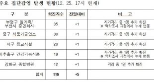 by 이장열 편집인 25일 오후5시 기준 인천시 방역당국은 집단감염 확진자가 전일 대비 5명 추가되어 모두 116명이라고 밝혔다. 인천시 방역당국에 따르면, 25일 오후5시 기준으로 「부평구 일가족/부천시 증권회사 관련」 기존 확진자 접촉자 1명이 자가격리 중 추가 확진되어 관련 확진자는 총 35명, 「중구 식품가공업소 관련」해서는 기존 확진자 접촉자 1명이 자가격리 중 추가 확진되어 …