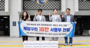 by 김성화 기자 계양구, 인천 북부권 문화예술회관 유치 염원 16만명 서명부 인천시 전달 계양구민 60%가 넘는 159,481명이 동참… 구민 염원 전달 그간 각종 규제로 소외된 계양의 설움 피력… 계양구 유치 필요성과 당위성 호소 24일 인천시 계양구(구청장 윤환)는 인천시가 추진하고 있는 북부지역 광역 문화예술회관의 계양구 유치를 염원하는 ‘범구민 16만 서명부’를 인천시에 …