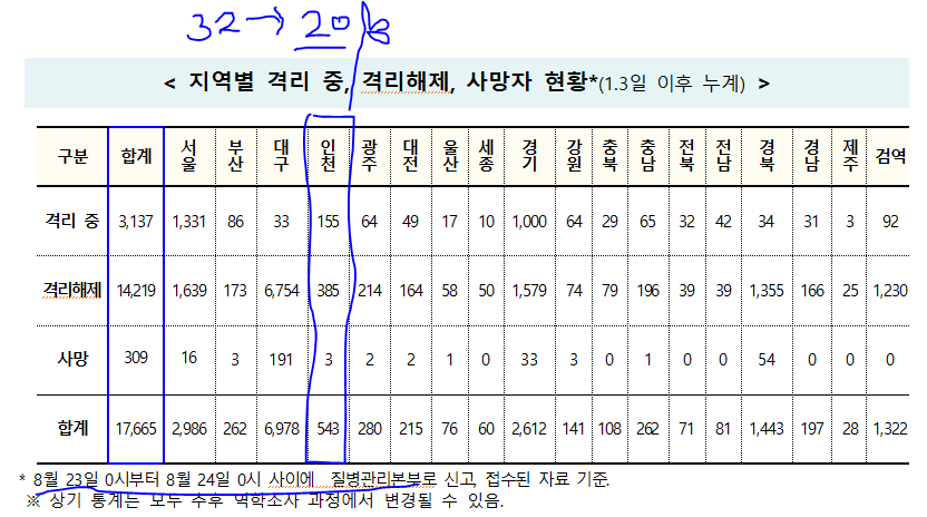[8/24/0시]코로나19인천지수:확진543명(전일대비 추가 20명: 지역감염 20명) 확진543명(20명:해외0명,지역20명),격리155명(20명),완치퇴원385명(-),사망3명(-) [질병관리본부]
