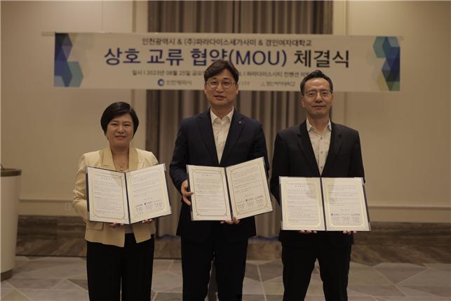 by 이장열 편집인 파라다이스산‧경인여자대학교학‧인천시관, 지역인재 채용 확대위한 업무협약 체결 – 현장형 실무자 및 전문 인력 양성과 취업 연계를 위한 인적‧물적 인프라 공유 – 최근 25일 인천시(시장 유정복)는 영종 파라다이스시티에서, 파라다이스시티, 경인여자대학교와 함께 지역인재 육성 및 채용 확대를 위한 업무협약을 체결했다고 밝혔다. 이날 협약으로 세 기관은 앞으로 복합리조트 분야의 현장형 실무자와 …