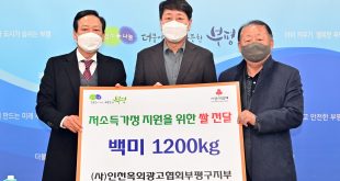 by 정재환 기자 최근 13일 부평구는 (사)인천옥외광고협회 부평구지부와 ‘저소득가정 지원을 위한 쌀 전달식’을 진행했다. (사)인천옥외광고협회 부평구지부는 그동안 풍수해 및 강풍 등에 대비해 옥외광고물 안전점검 사업에 참여했으며, 불법광고물 근절 캠페인을 실시하는 등 공익활동에도 앞장서고 있다. 이날 전달받은 쌀 1천200kg은 지역 내 저소득가정 등에 전달할 예정이다. 이영철 (사)인천옥외광고협회 부평구지부장은 “회원들의 작은 정성이 …