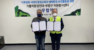 by 김성화 기자 최근 22일 부평구자원봉사센터는 가톨릭환경연대와 지속가능한 상호협력 체제를 구축하고자 업무협력 협약을 맺었다. 이번 협약은 기후위기시대에 탄소중립과 생태환경 보전을 위한 자원봉사 활성화를 통해 안정적이고 지속가능한 상호협력 체제를 구축하고자 마련됐다. 이번 협약을 통해 자원봉사센터는 가톨릭환경연대와 플로깅, 그린플래너 및 환경교육과 쓰담활동 등 환경보전 활동을 함께 진행하기로 했다. 부평구자원봉사센터 이병철 소장은 “환경 …