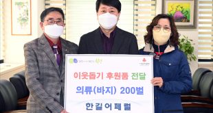 by 정재환 기자 24일 부평구가 청천동 소재 의류 전문 업체 한길어페럴로부터 의류(바지)200벌을 전달 받았다. 한길어페럴 김현옥 대표는 “코로나19로 힘든 시간을 보내고 있는 주변의 어려운 이웃에게 조금이나마 도움이 되길 바라는 마음으로 기부하게 됐다”고 말했다. 차준택 구청장은 “이웃사랑 실천에 동참해준 한길어페럴에 감사하다”며 “기탁 받은 의류는 부평구 내 어려운 이웃들이 따뜻한 겨울을 보낼 …