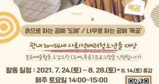 by 이장열 편집인 부평구청소년수련관이 지역 내 사회적배려 청소년을 대상으로 하는 ‘오감오락’ 도예·목공 프로그램 참가자를 선착순 모집한다. 이번 활동은 지역 내 10~14세 사회적배려 청소년이 대상이며 신청은 오는 7월 10일까지, 본 활동은 7월 24일부터 8월 28일까지 진행한다. 프로그램 중 도예는 흙을 활용해 화분이나 캐릭터 접시 등을 만들고, 목공은 나무로 청소년들이 사용할 수 …