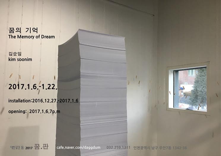 취재: 편집부_lool@incheonpost.com 김순인 전… 꿈의 기억/ The Memory of Dream 전시기간: 2017.1.6.-2017.1.22. open : 1-9p.m(월요일 휴관) 설치기간: 2016.12.27.-2017.1.6. http://cafe.naver.com/daggdum/36 대안공간 듬 인천광역시 남구 주승로69번길 22 (인천광역시 남구 주안동 1342-36번지) Tel. +82. (0)32.259.1311